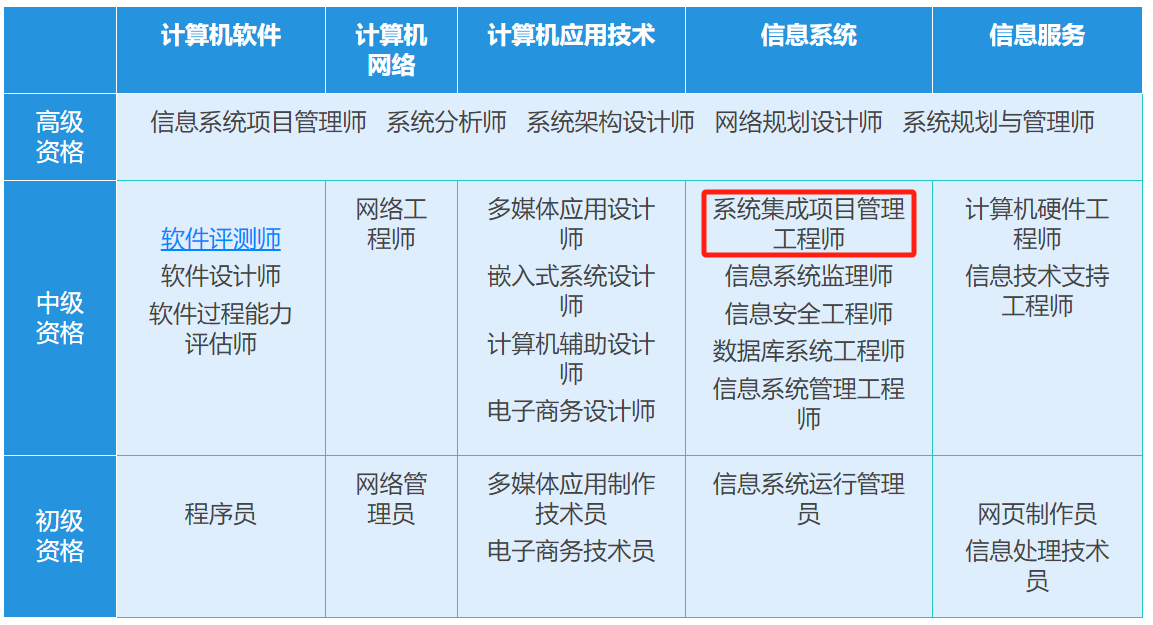 計算機軟件資格考試設置了27個專業(yè)資格,涵蓋5個專業(yè)領域, 3個級別層次(初級、中級、高級);其中,系統(tǒng)集成項目管理工程師屬于信息系統(tǒng)專業(yè)中的中級資格考試。