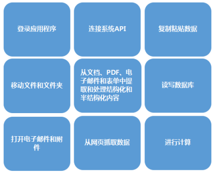 RPA機器人能夠模仿大多數(shù)人類用戶的行為。它們能夠登錄應用程序、移動文件和文件夾、復制和粘貼數(shù)據(jù)、填寫表單、從文檔中提取結(jié)構(gòu)化和半結(jié)構(gòu)化數(shù)據(jù)、抓取瀏覽器等。