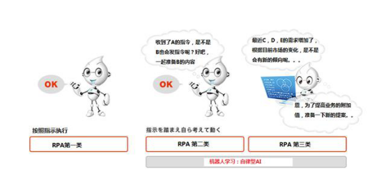 RPA分為三個類別,其中第二類和第三類是機器學習,也就是所謂的自律型AI。據(jù)說完全按照指示執(zhí)行動作的機器人是RPA的第一類,能夠靈活地對應于變化并且能夠自己思考的機器人是RPA的第二類或第三類,從概念上來講RPA是包含AI在內(nèi)的。