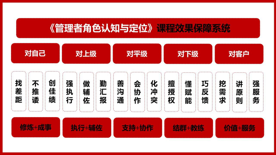 課程簡(jiǎn)述:通過(guò)理清管理者角色認(rèn)知與定位,以此促進(jìn)管理者能力提升,找準(zhǔn)自己的位置