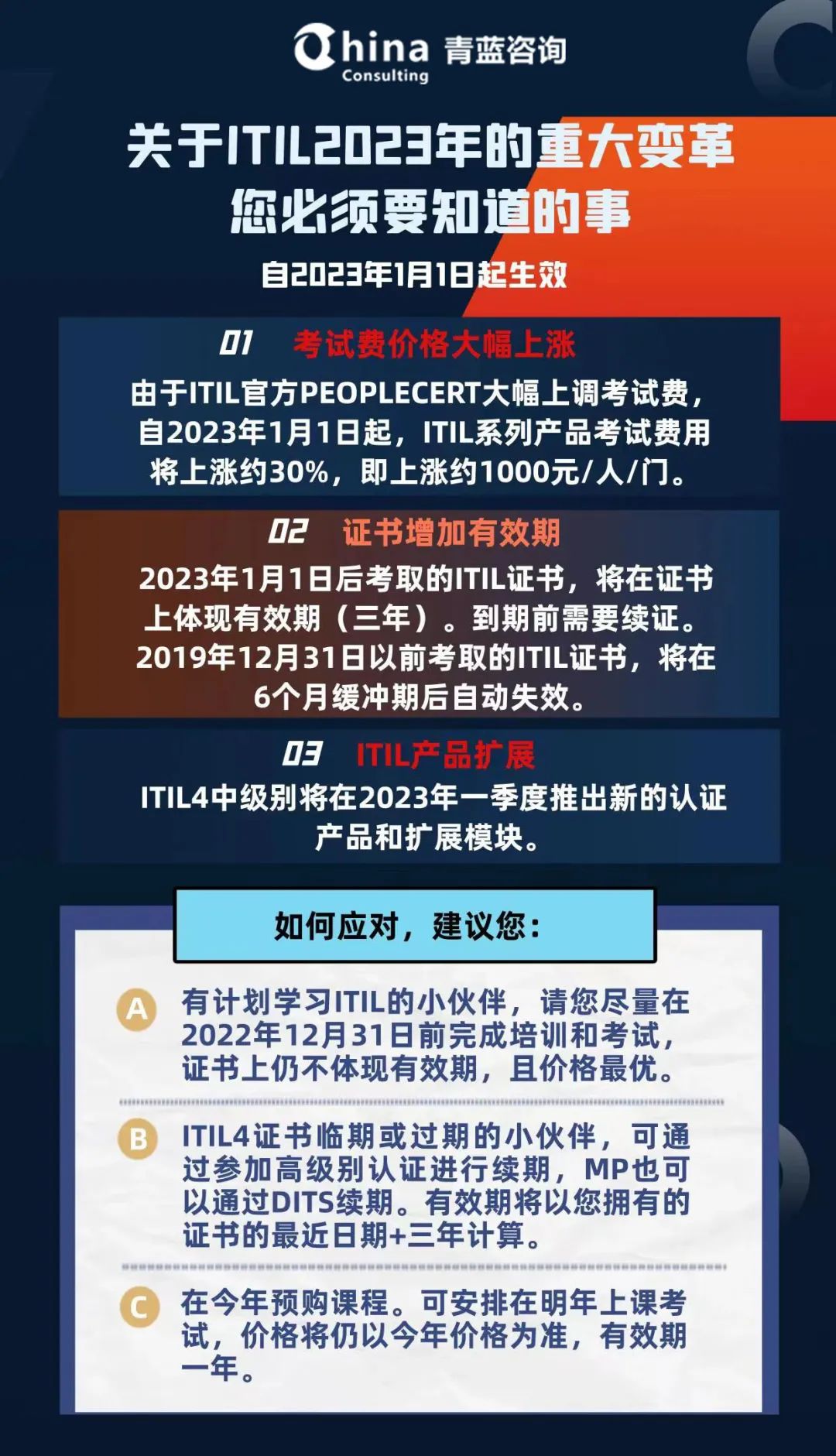 【ITIL變革】關(guān)于ITIL2023年的重大變革,您必須要知道的事 發(fā)布時(shí)間:2022-11-11 點(diǎn)擊數(shù):3243 分享到: 下一篇:【PMI通知】PMI已開(kāi)通便捷的人民幣付款,保姆級(jí)操作教程來(lái)了!